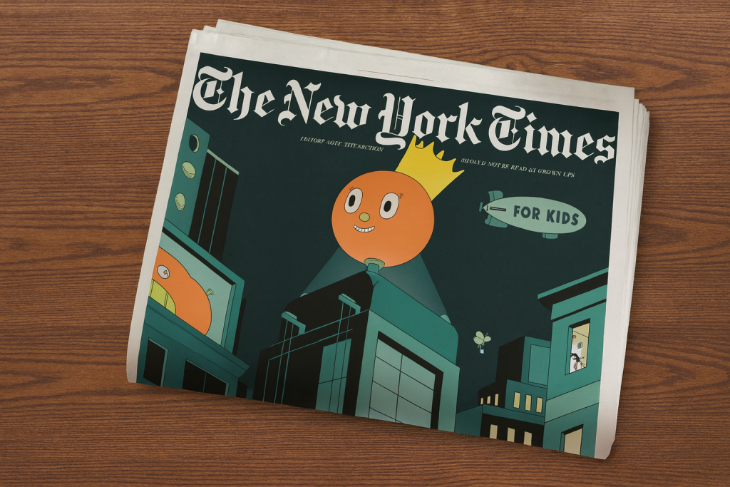 لوگوی کلاسیک بخش کودکان نیویورک تایمز هم برای هر شماره و هر بار با خلاقیت طراحی میشد. گاهی همهجاش پاپکورن داشت، گاهی چسب مایع ازش چکه میکرد. کلمات “for kids”/«برای بچهها» هم با شیطنت و بازیگوشی، گاهی تو دست یه اختاپوس و گاهی شناور در هوا ظاهر میشدن. برای خیلی از مخاطبها، این دیزاینها یادآور مجله MAD و کارتهای قدیمی هیولا بود.