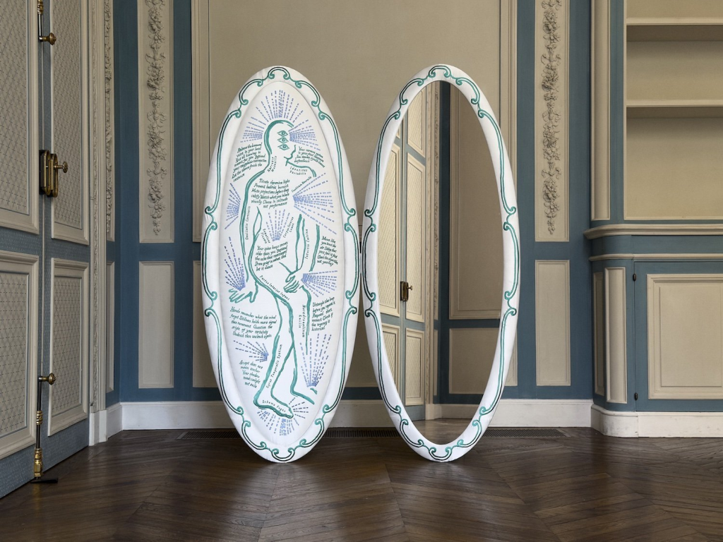 Duyi Han، طراح مستقر در شانگهای، در اثرش بهنام Noetigram v0.9 سراغ آینه رفته، اما نه اونجوری که بهطور معمول برای بازتاب چهره سراغش میریم. هان بیشتر به آینه بهعنوان ابزاری برای بازاندیشی نگاه میکنه. سطح آینه ترکیبی از دو لایهست: نقشهای گلدوزیشدهی ساتن که یادآور نمودارهای آناتومیکی و نقشههای طب سوزنیان. Han میگه بخش زیادی از این آینه رو خودش با ترکیب دادههای تصویری و متنی ساخته که از هوش مصنوعی گرفته.